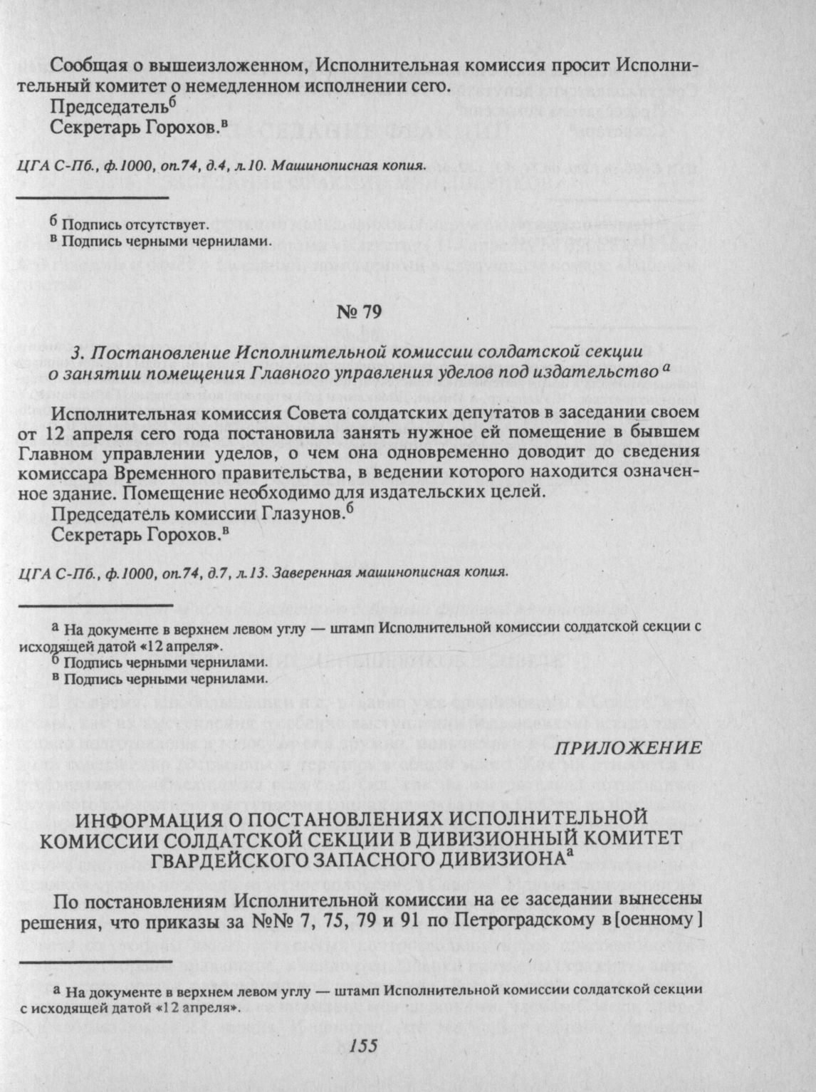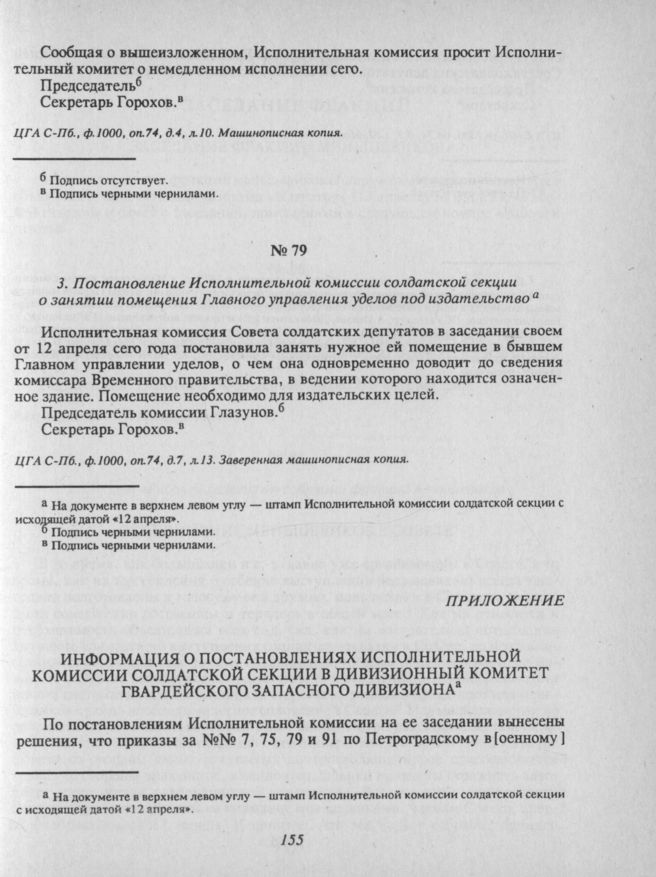 12 апреля. III. Заседание Исполнительной комиссии солдатской секции. Приложение. Информация о постановлениях Исполнительной комиссии солдатской секции в дивизионный комитет гвардейского запасного дивизиона // ЦГА С-Пб, Ф. 1000, Оп. 74, Д. 3, Л. 32. Машинописная копия.