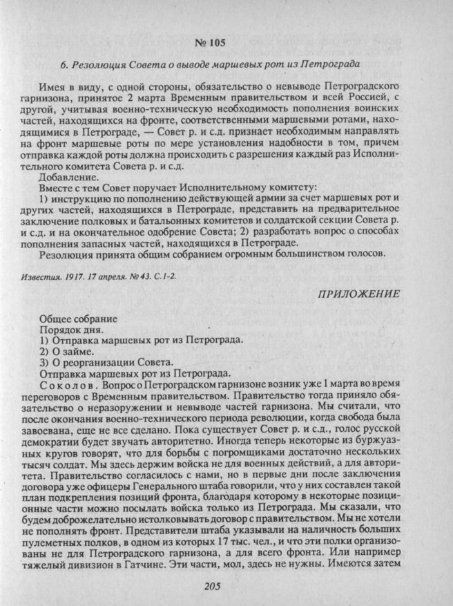 16 апреля. III. Общее собрание. 6. Резолюция Совета о выводе маршевых рот из Петрограда // Известия. 1917. 17 апреля. № 43. С. 1-2.