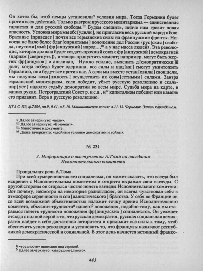 29 апреля. III. Заседание Исполнительного комитета. 3. Информация о выступлении А.Тома на заседании Исполнительного комитета // ЦГА С-Пб, Ф. 7384, Оп. 9, Д. 41, Л. 13. Черновик. Запись карандашом.