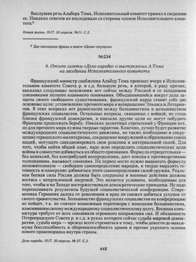 29 апреля. III. Заседание Исполнительного комитета. 6. Отчет газеты «Дело народа» о выступлении А.Тома на заседании Исполнительного комитета // Дело народа. 1917. 30 апреля. № 37. С. 3.