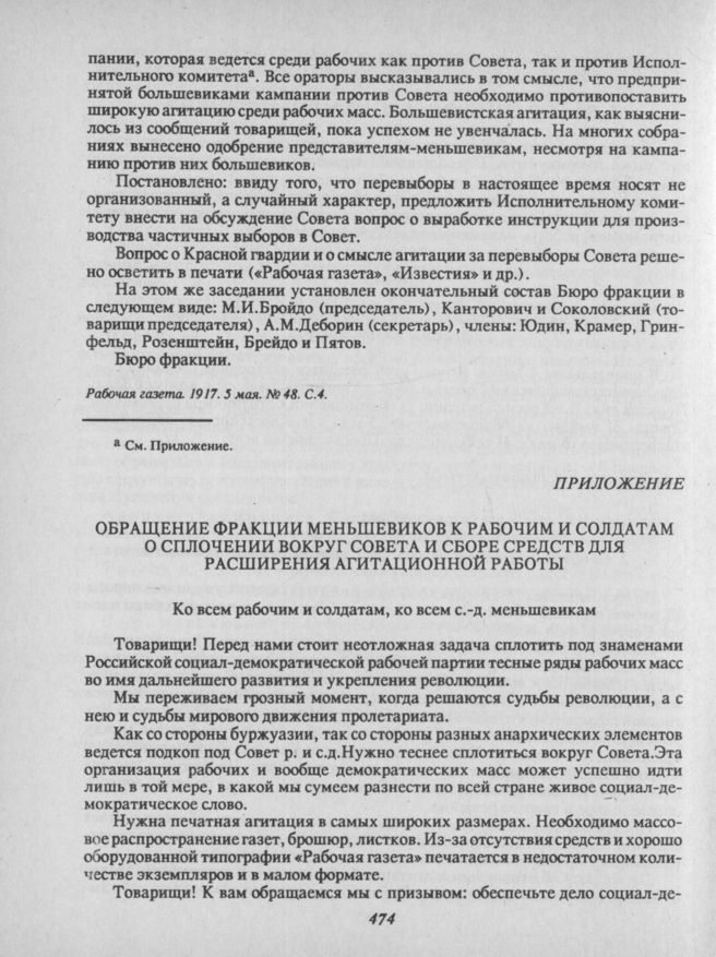 1 мая. I. Заседание фракции меньшевиков. Приложение. Обращение фракции меньшевиков к рабочим и солдатам о сплочении вокруг совета и сборе средств для расширении агитационной работы // Рабочая газета 1917. 2 мая. № 45. С. 1.