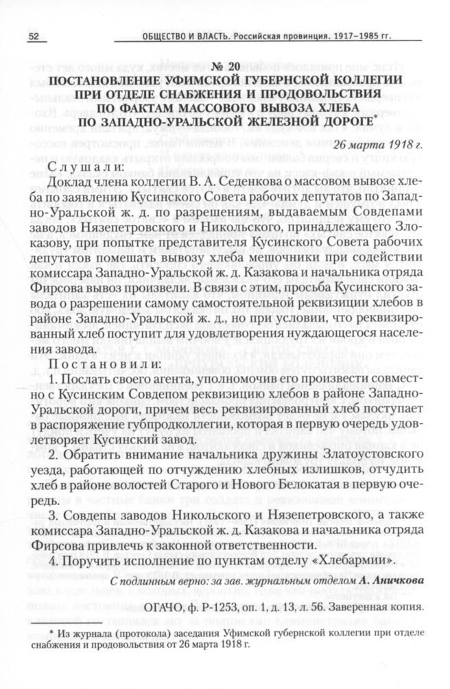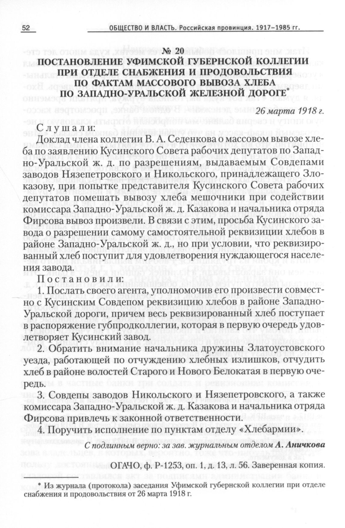 Постановление Уфимской губернской коллегии при отделе снабжения и продовольствия по фактам массового вывоза хлеба по Западно-Уральской железной дороге, 26 марта 1918 г. // ОГАЧО, Ф. P-1253, Оп. 1, Д. 13, Л. 56. Заверенная копия.