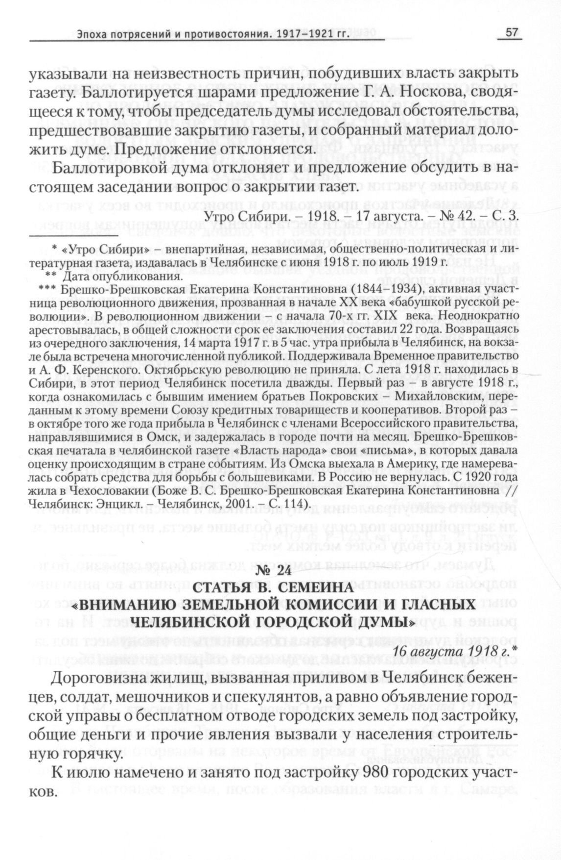 Статья В. Семеина «Вниманию земельной комиссии и гласных Челябинской городской думы», 16 августа 1918 г. // Утро Сибири. - 1918. - 16 августа. - № 41. - С. 3.