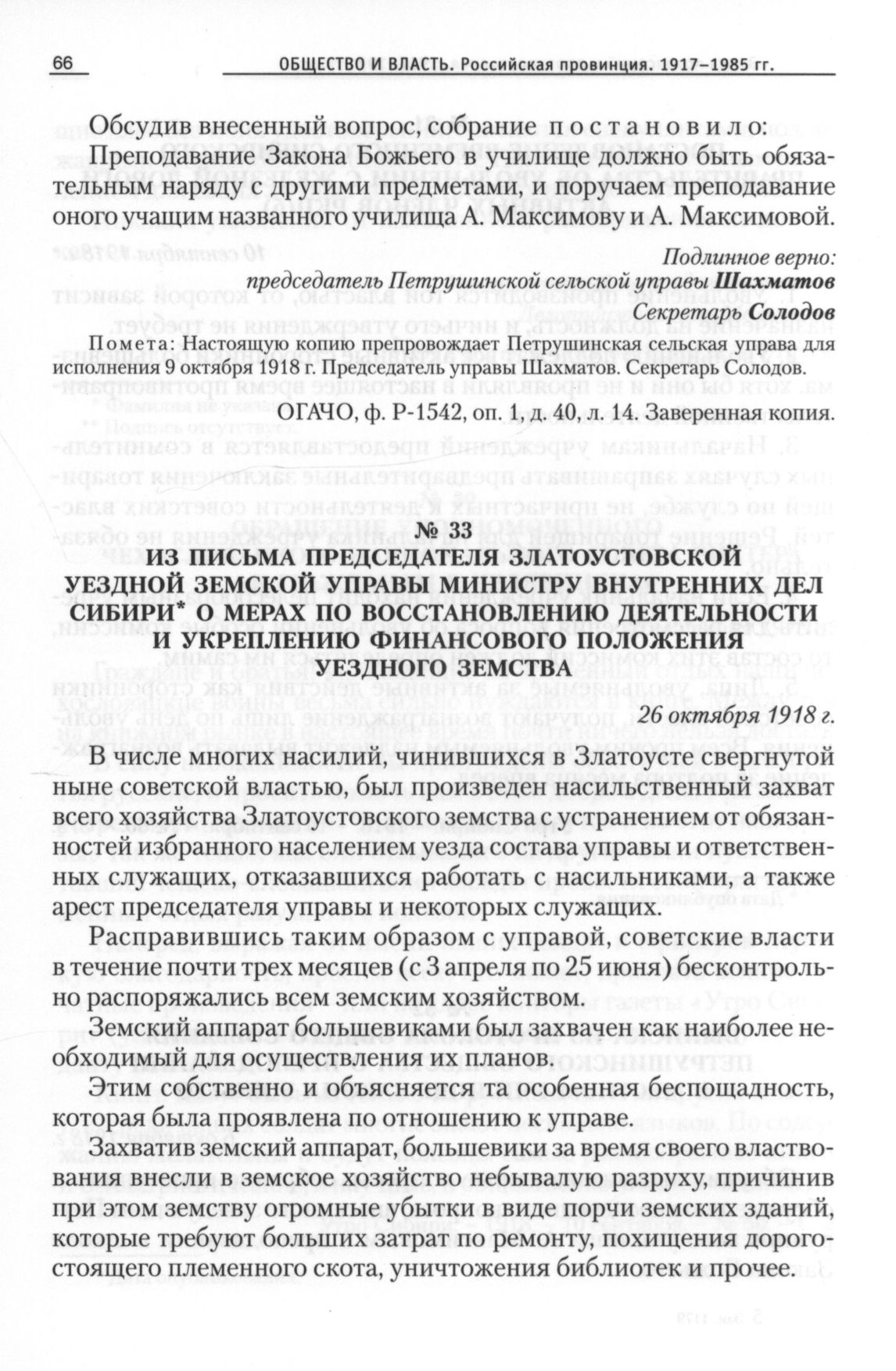 Из письма председателя Златоустовской уездной земской управы министру внутренних дел Сибири о мерах по восстановлению деятельности и укреплению финансового положения уездного земства, 26 октября 1918 г. // ОГАЧО, Ф. P-288, Оп. 1, Д. 11, Л. 432-433. Заверенная копия.