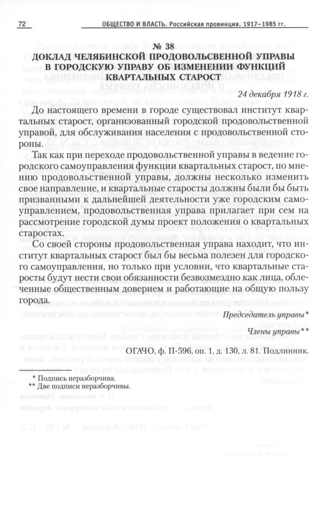 Доклад Челябинской продовольственной управы в городскую управу об изменении функций квартальных старост, 24 декабря 1918 г. // ОГАЧО, Ф. П-596, Оп. 1, Д. 130, Л. 81. Подлинник.
