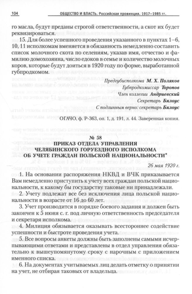 Приказ отдела управления Челябинского горуездного исполкома об учете граждан польской национальности, 26 мая 1920 г. // ОГАЧО, Ф. P-1542, Оп. 1, Д. 156, Л. 2. Типографский экз.