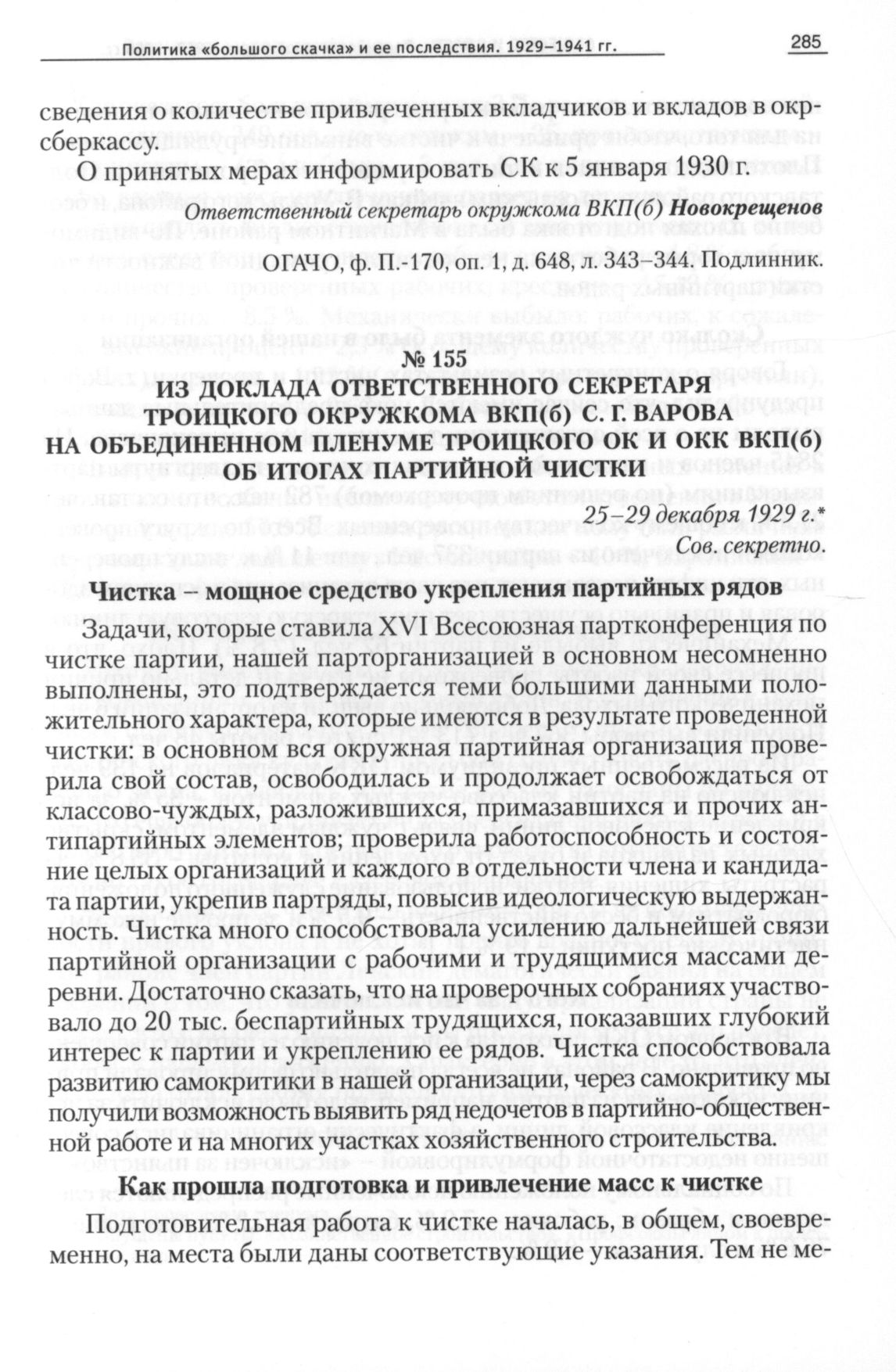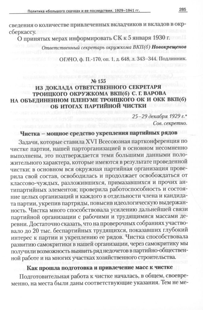 Из доклада ответственного секретаря Троицкого окружкома ВКП(б) С. Г. Варова на объединенном пленуме Троицкого ОК и ОКК ВКП(б) об итогах партийной чистки, 25-29 декабря 1929 г. // ОГАЧО, Ф. П-170, Оп. 1, Д. 650, Л. 1-2, 5. Подлинник.