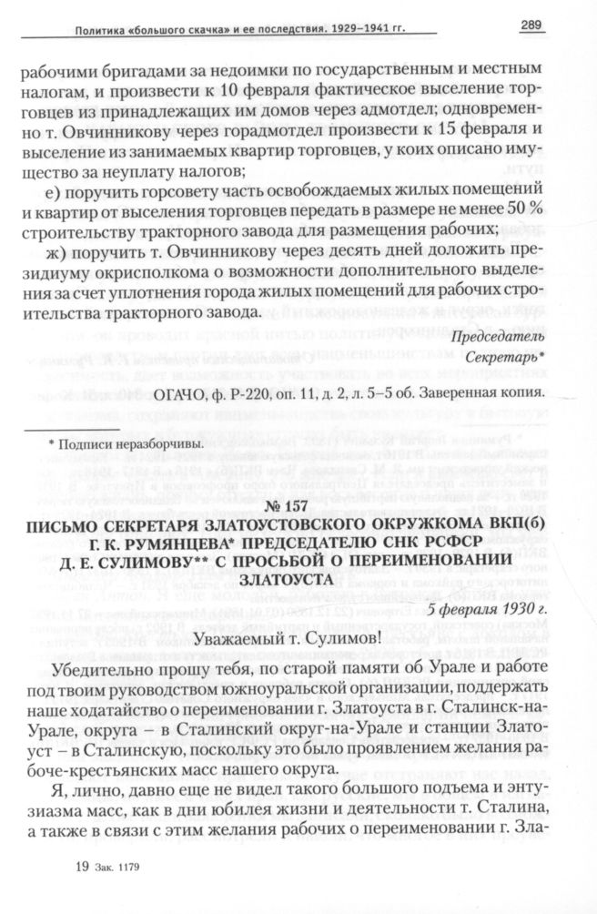 Письмо секретаря Златоустовского окружкома ВКП(б) Г. К. Румянцева председателю СНК РСФСР Д. Е. Сулимову с просьбой о переименовании Златоуста, 5 февраля 1930 г. // ОГАЧО, Ф. П-317, Оп. 1, Д. 340, Л. 51. Копия.