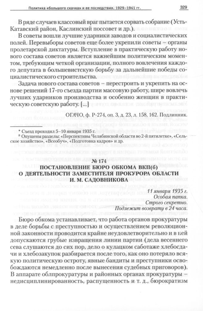 Постановление бюро обкома ВКП(б) о деятельности заместителя прокурора области И. М. Садовникова, 11 января 1935 г. // ОГАЧО, Ф. П-288, Оп. 42, Д. 1, Л. 311-311 об. Отпуск.