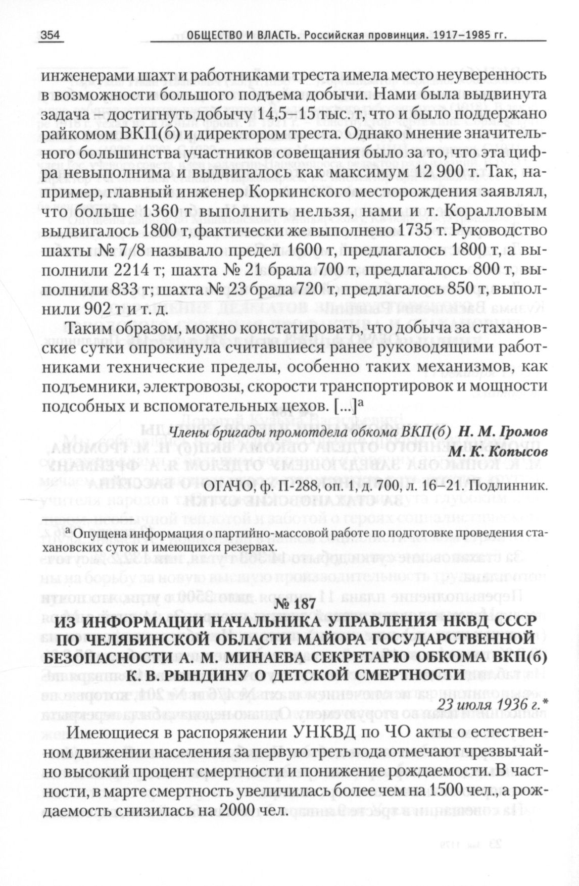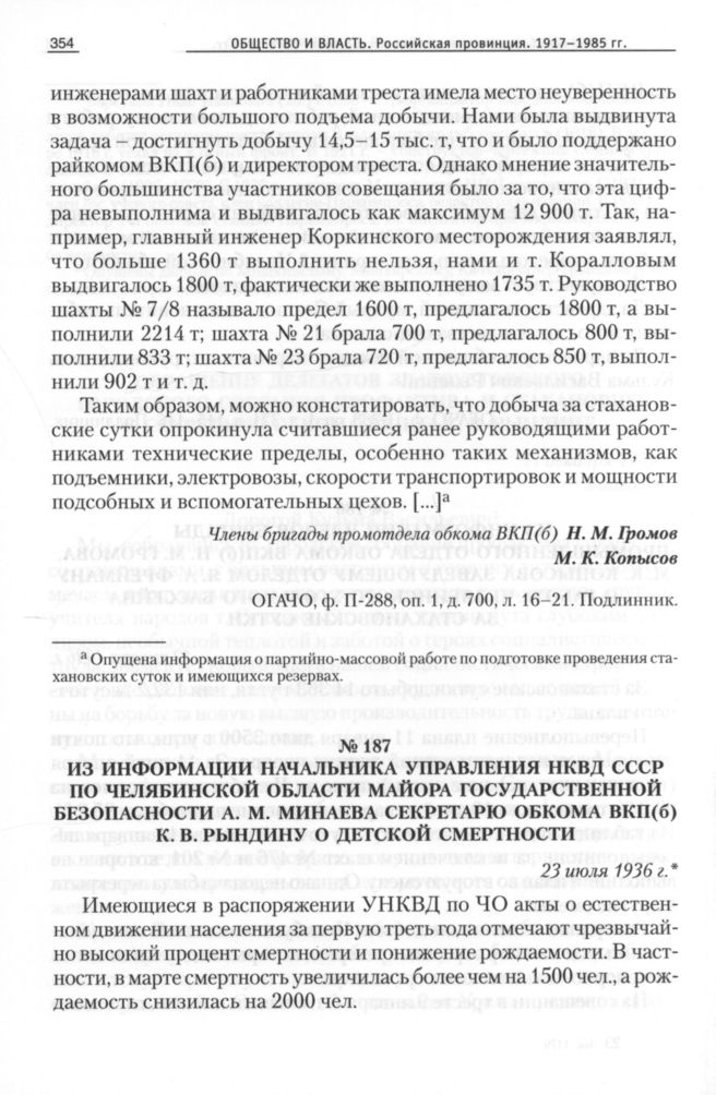 Из информации начальника управления НКВД СССР по Челябинской области майора государственной безопасности А. М. Минаева секретарю обкома ВКП(б) К. В. Рындину о детской смертности, 23 июля 1936 г. // ОГАЧО, Ф. П-288, Оп. 42, Д. 2, Л. 135-138. Подлинник.