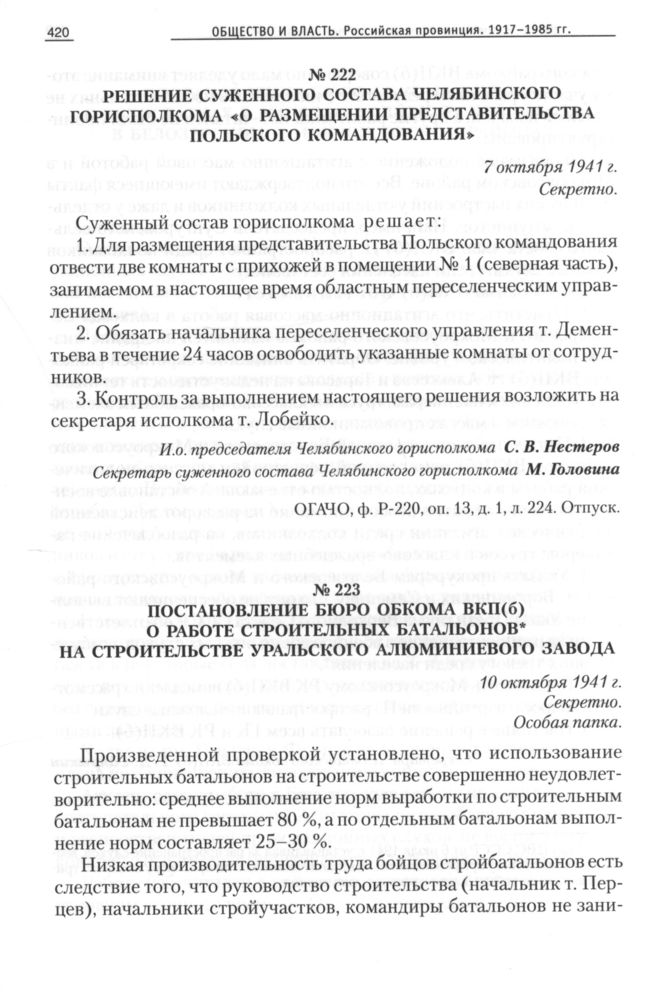 Решение суженного состава Челябинского горисполкома «О размещении представительства польского командования», 7 октября 1941 г. // ОГАЧО, Ф. Р-220, Оп. 13, Д. 1, Л. 224. Отпуск.