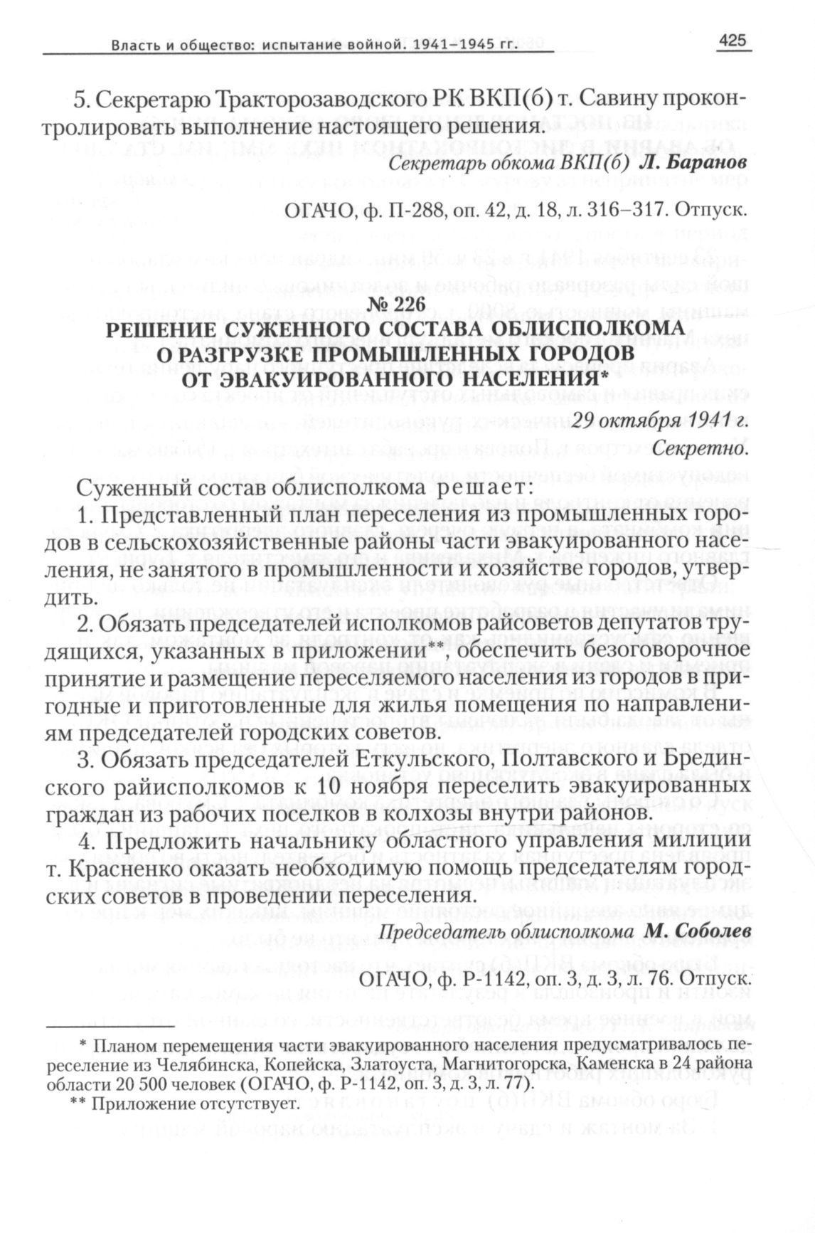 Решение суженного состава облисполкома о разгрузке промышленных городов от эвакуированного населения, 29 октября 1941 г.