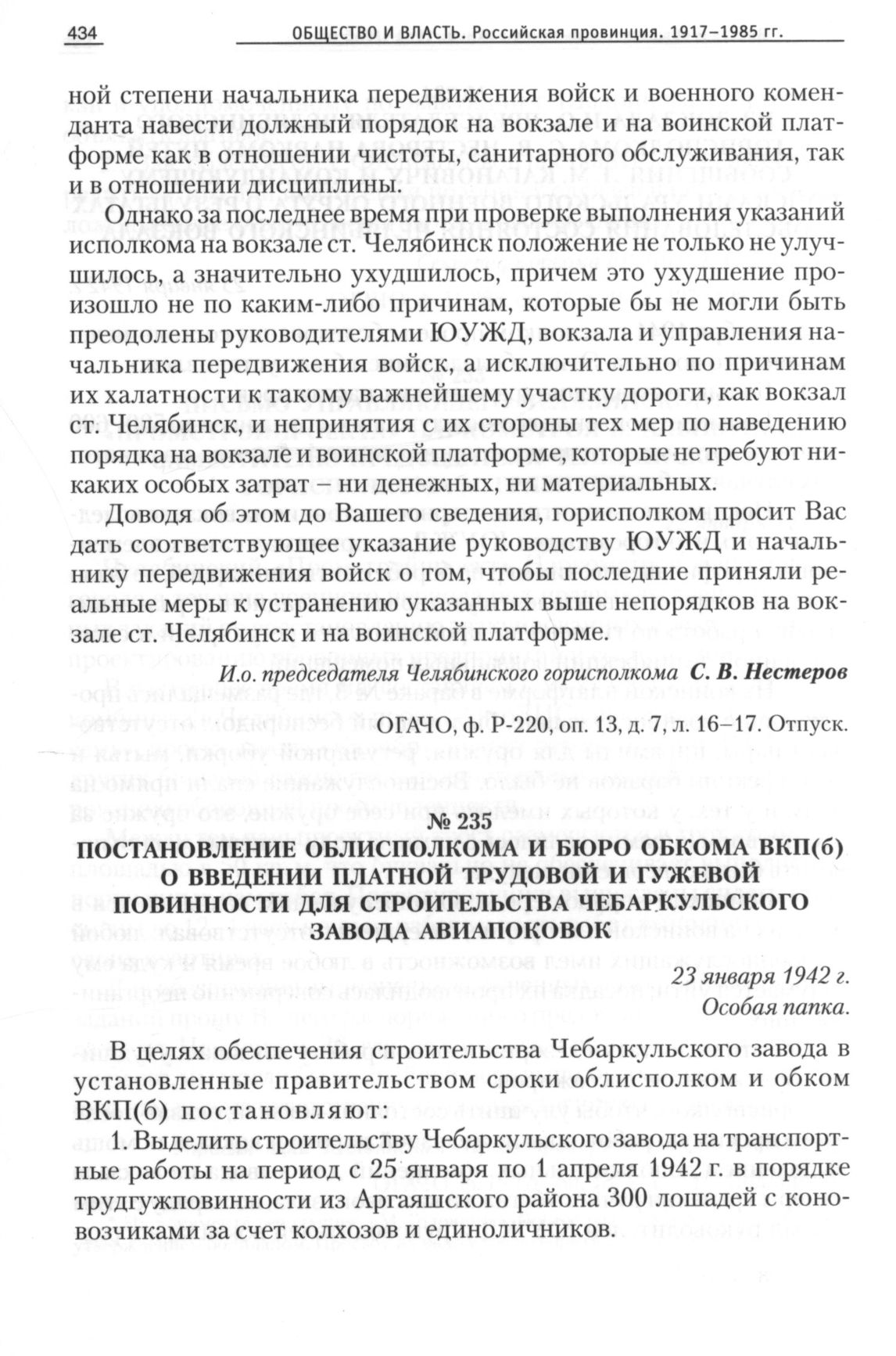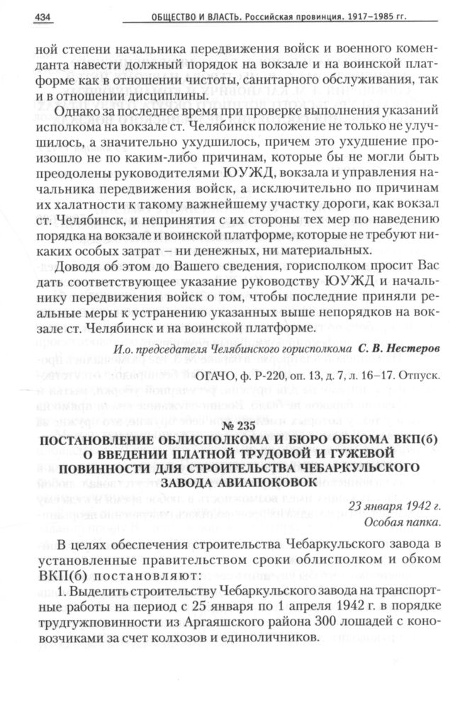Постановление облисполкома и бюро обкома ВКП(б) о введении платной трудовой и гужевой повинности для строительства Чебаркульского завода авиапоковок, 23 января 1942 г. // ОГАЧО, Ф. П-288, Оп. 42, Д. 20, Л. 114-115. Отпуск.