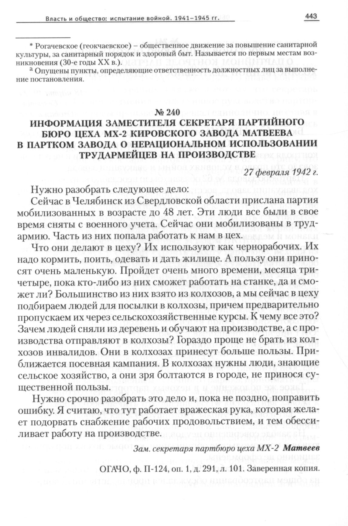 Информация заместителя секретаря партийного бюро цеха МХ-2 Кировского завода Матвеева в партком завода о нерациональном использовании трудармейцев на производстве, 27 февраля 1942 г. // ОГАЧО, Ф. П-124, Оп. 1, Д. 291, Л. 101. Заверенная копия.