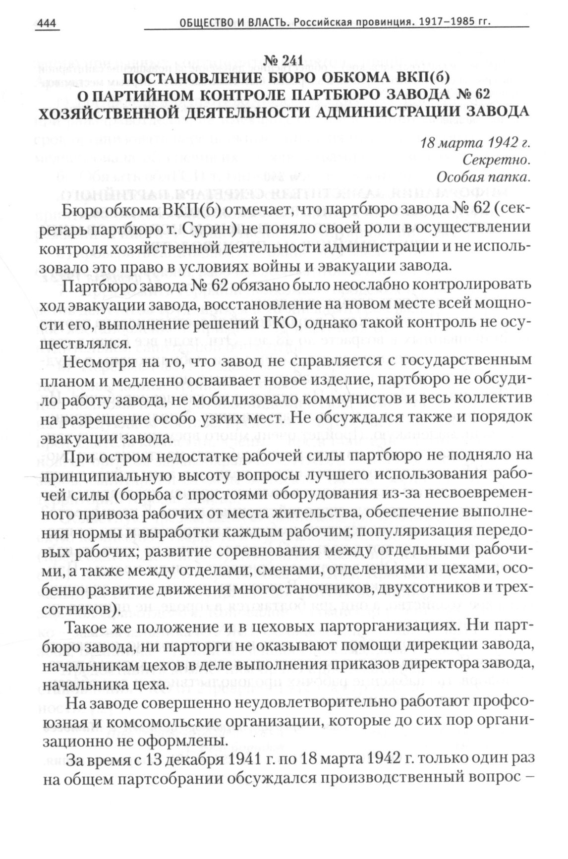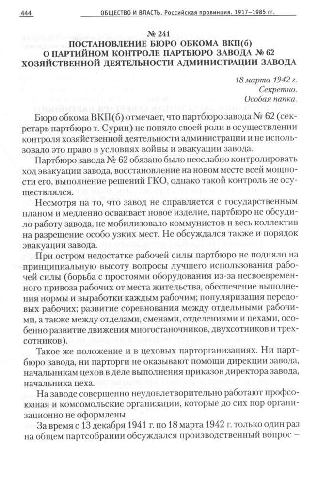 Постановление бюро обкома ВКП(б) о партийном контроле партбюро завода № 62 хозяйственной деятельности администрации завода, 18 марта 1942 г. // ОГАЧО, Ф. П-288, Оп. 42, Д. 20, Л. 368-370. Отпуск.