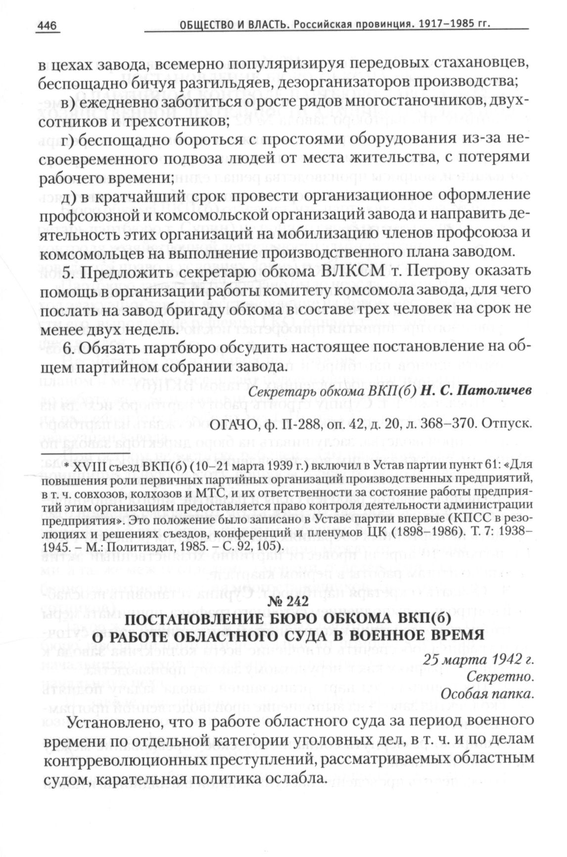 Постановление бюро обкома ВКП(б) о работе областного суда в военное время, 25 марта 1942 г. // ОГАЧО, Ф. П-288, Оп. 42, Д. 20, Л. 419-421. Отпуск.