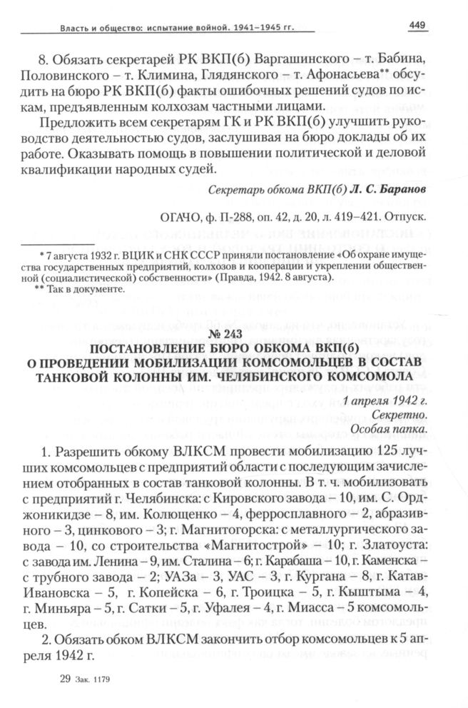 Постановление бюро обкома ВКП(б) о проведении мобилизации комсомольцев в состав танковой колонны им. Челябинского комсомола, 1 апреля 1942 г. // ОГАЧО, Ф. П-288, Оп. 42, Д. 20, Л. 441. Отпуск.