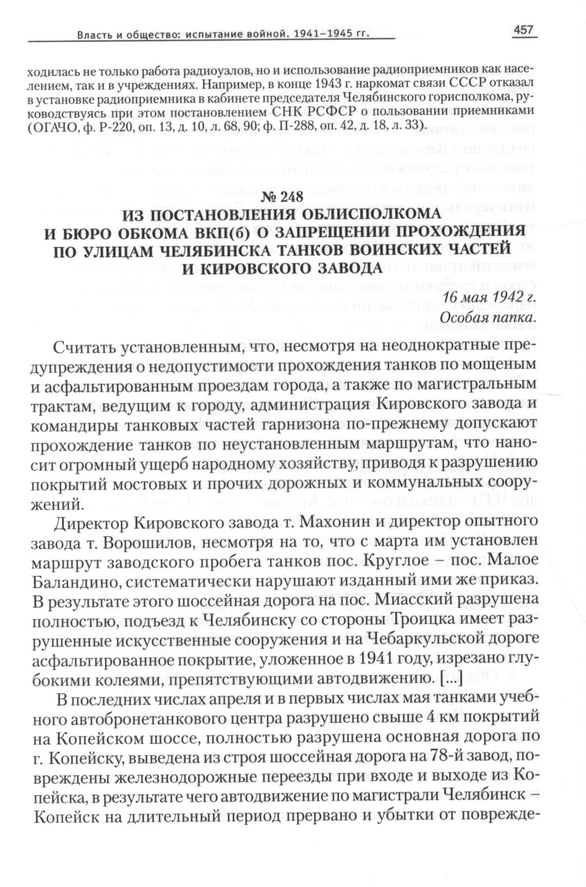 Из постановления облисполкома и бюро обкома ВКП(б) о запрещении прохождения по улицам Челябинска танков воинских частей и Кировского завода, 16 мая 1942 г. // ОГАЧО, Ф. П-288, Оп. 42, Д. 21, Л. 25-28. Отпуск.
