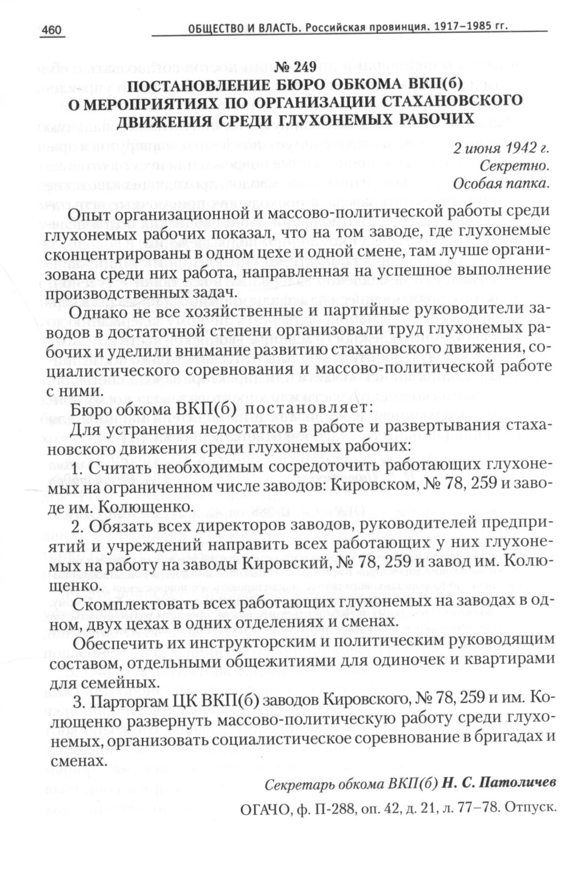 Постановление бюро обкома ВКП(б) о мероприятиях по организации стахановского движения среди глухонемых рабочих, 2 июня 1942 г. // ОГАЧО, Ф. П-288, Оп. 42, Д. 21, Л. 77-78. Отпуск.