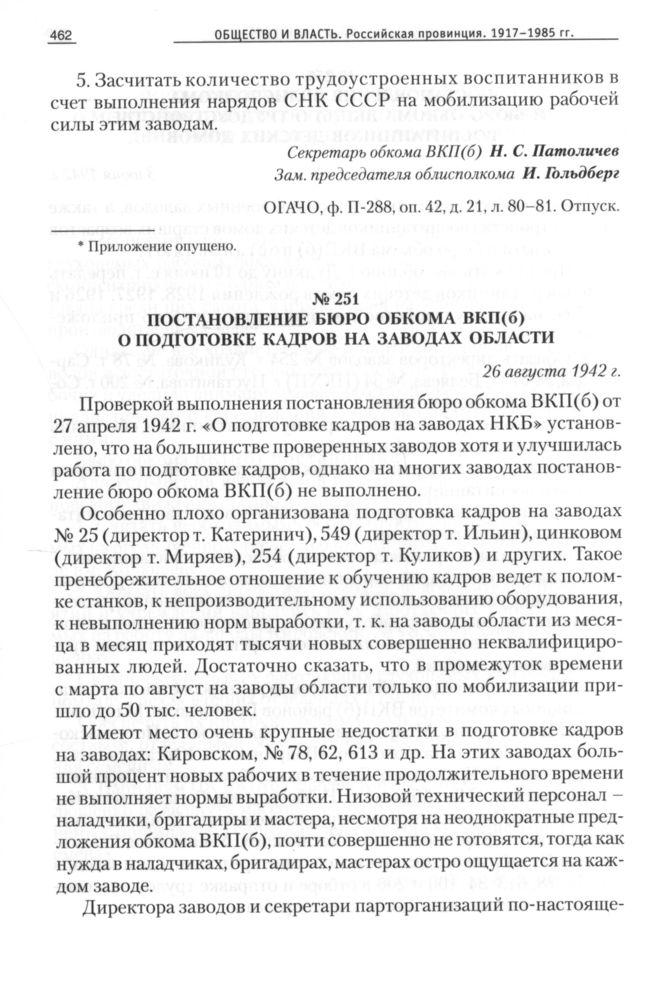 Постановление бюро обкома ВКП(б) о подготовке кадров на заводах области, 26 августа 1942 г. // ОГАЧО, Ф. П-288, Оп. 42, Д. 21, Л. 522 об. Отпуск.