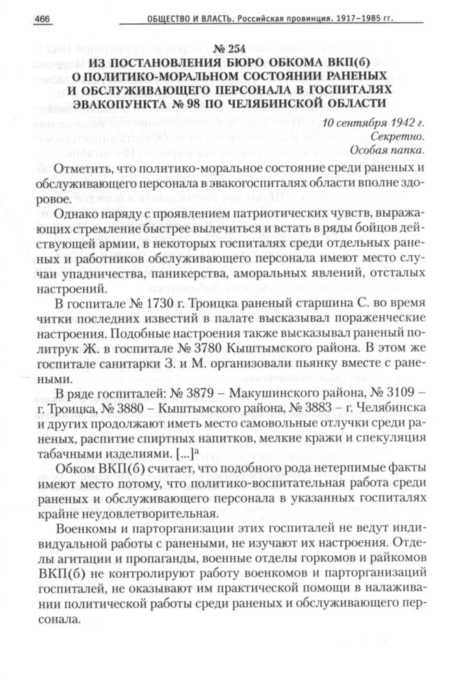 Из постановления бюро обкома ВКП(б) о политико-моральном состоянии раненых и обслуживающего персонала в госпиталях эвакопункта № 98 по Челябинской области, 10 сентября 1942 г. // ОГАЧО, Ф. П-288, Оп. 42, Д. 21, Л. 657-657 об. Отпуск.