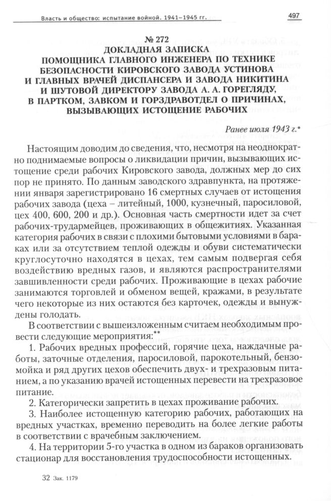 Докладная записка помощника главного инженера по технике безопасности Кировского завода Устинова и главных врачей диспансера и завода Никитина и Шутовой директору завода А. А. Горегляду, в партком, завком и горздравотдел о причинах, вызывающих истощение рабочих, Ранее июля 1943 г. // ОГАЧО, Ф. П-124, Оп. 1, Д. 285, Л. 55. Копия.