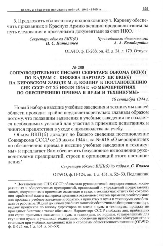 Сопроводительное письмо секретаря обкома ВКП(б) по кадрам С. Князева парторгу ЦК ВКП(б) на Кировском заводе М. Д. Козину к постановлению СНК СССР от 25 июля 1944 г. «О мероприятиях по обеспечению приема в вузы и техникумы», 16 сентября 1944 г. // ОГАЧО, Ф. П-124, Оп. 1, Д. 451, Л. 52-53. Подлинник.