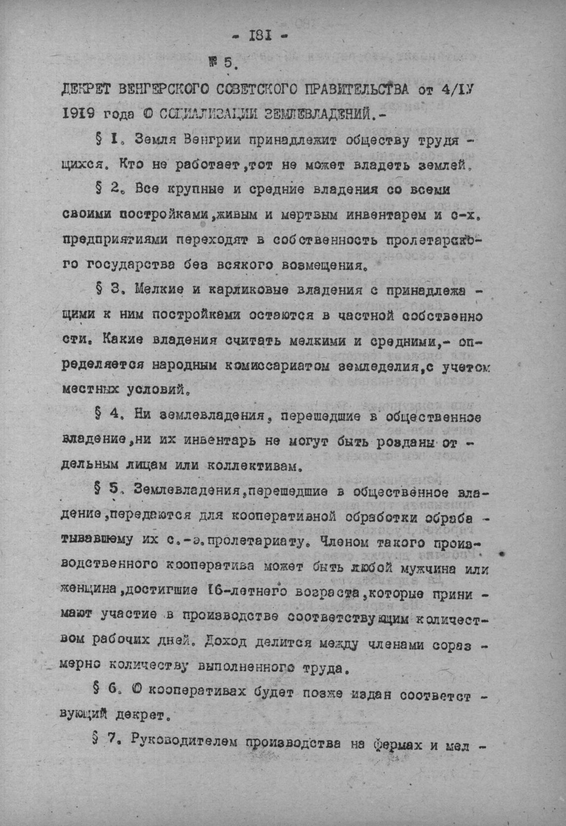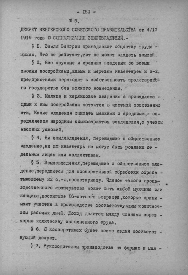 Декрет Венгерского советского правительства от 4/IV 1919 года О социализации землевладений. Будапешт, 3 апр. 1919