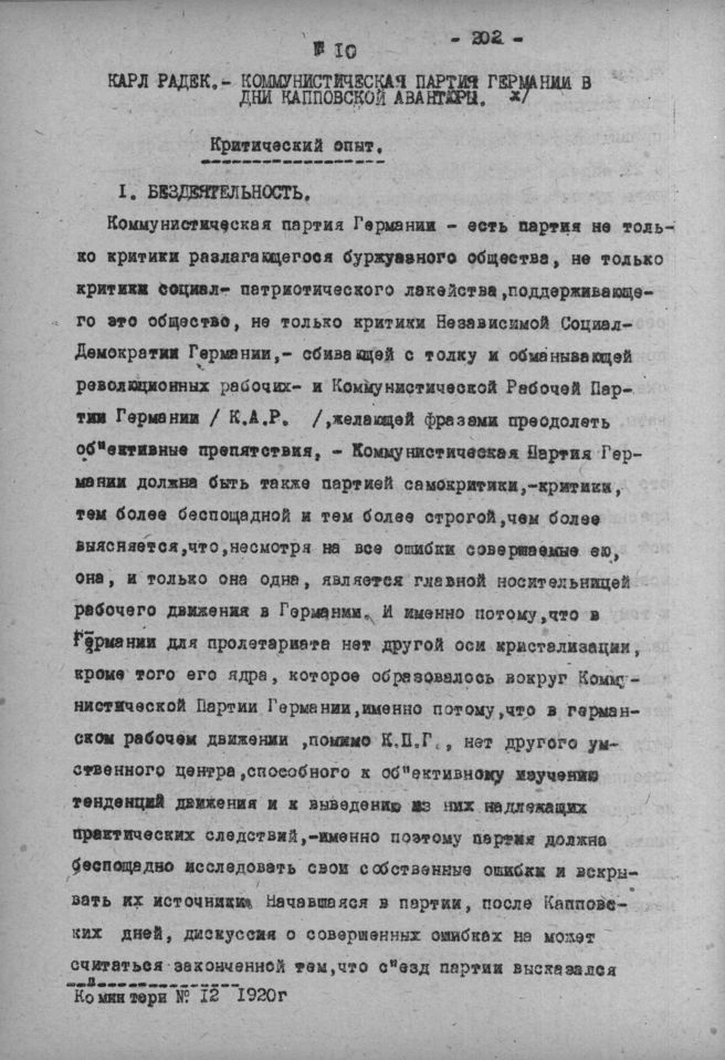 Карл Радек. Коммунистическая партия Германии в дни Капповской авантюры // Коминтерн № 12 1920 г.