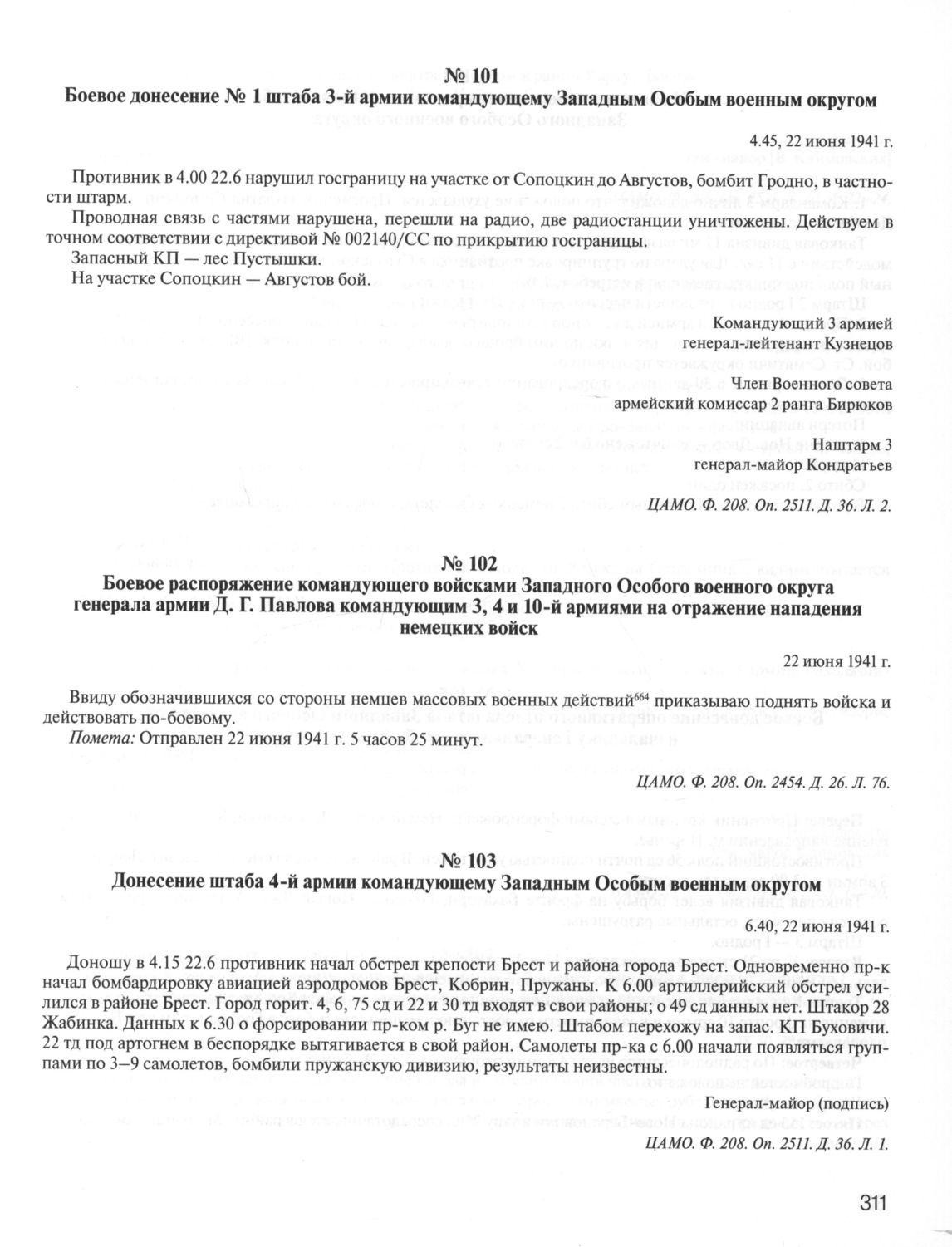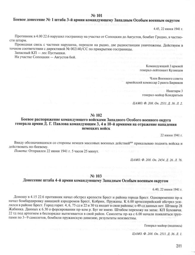 Донесение штаба 4-й армии командующему Западным Особым военным округом. 22 июня 1941 г. // ЦАМО. Ф. 208. Оп. 2511. Д. 36. Л. 1.