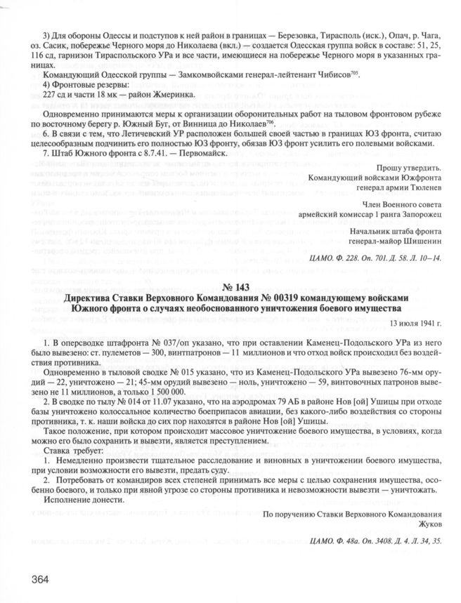 Директива Ставки Верховного Командования № 00319 командующему войсками Южного фронта о случаях необоснованного уничтожения боевого имущества. 13 июля 1941 г. // ЦАМО. Ф. 48а. Оп. 3408. Д. 4. Л. 34, 35.