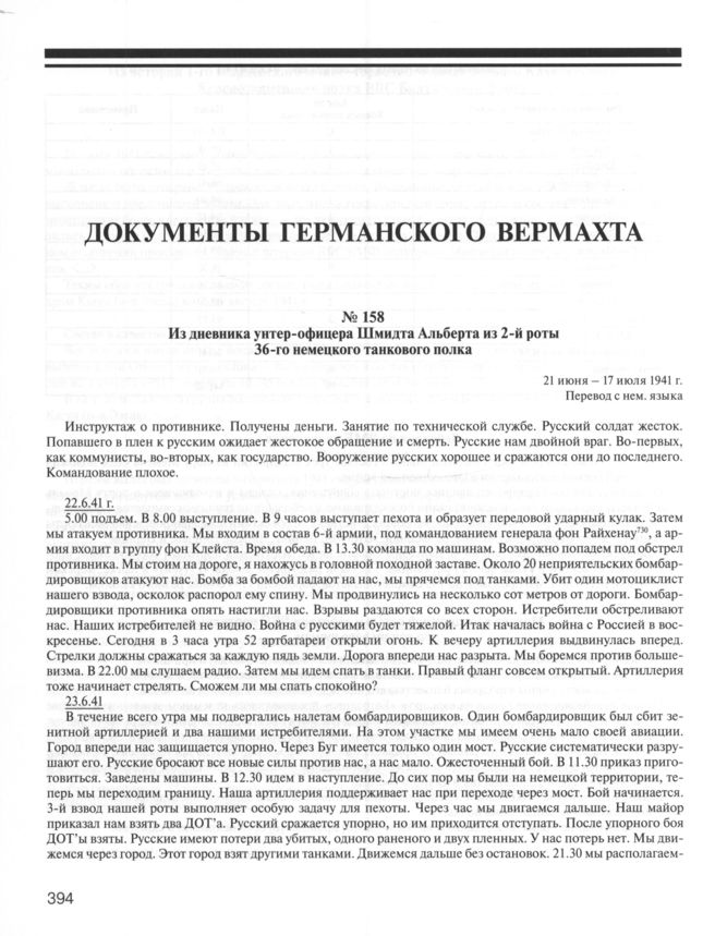 Из дневника унтер-офицера Шмидта Альберта из 2-й роты 36-го немецкого танкового полка. 21 июня — 17 июля 1941 г. Перевод с нем. языка
