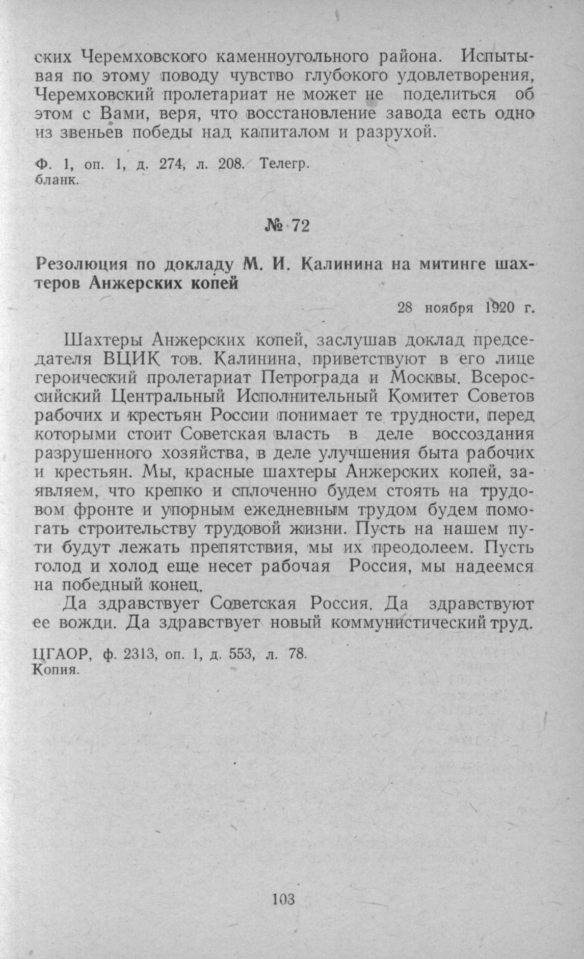 Резолюция по докладу М. И. Калинина на митинге шахтеров Анжерских копей. 28 ноября 1920 г. // ЦГАОР. ф. 2313. oп. 1, д. 553, л. 78. Копия.