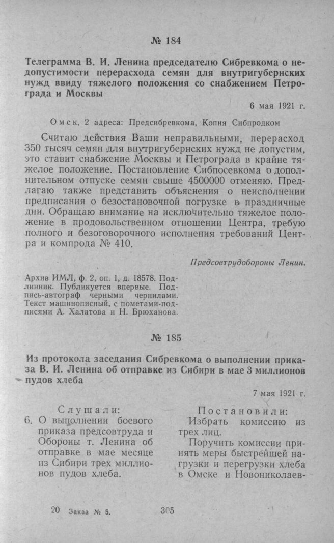 Из протокола заседания Сибревкома о выполнении приказа В. И. Ленина об отправке из Сибири в мае 3 миллионов пудов хлеба. 7 мая 1921 г.