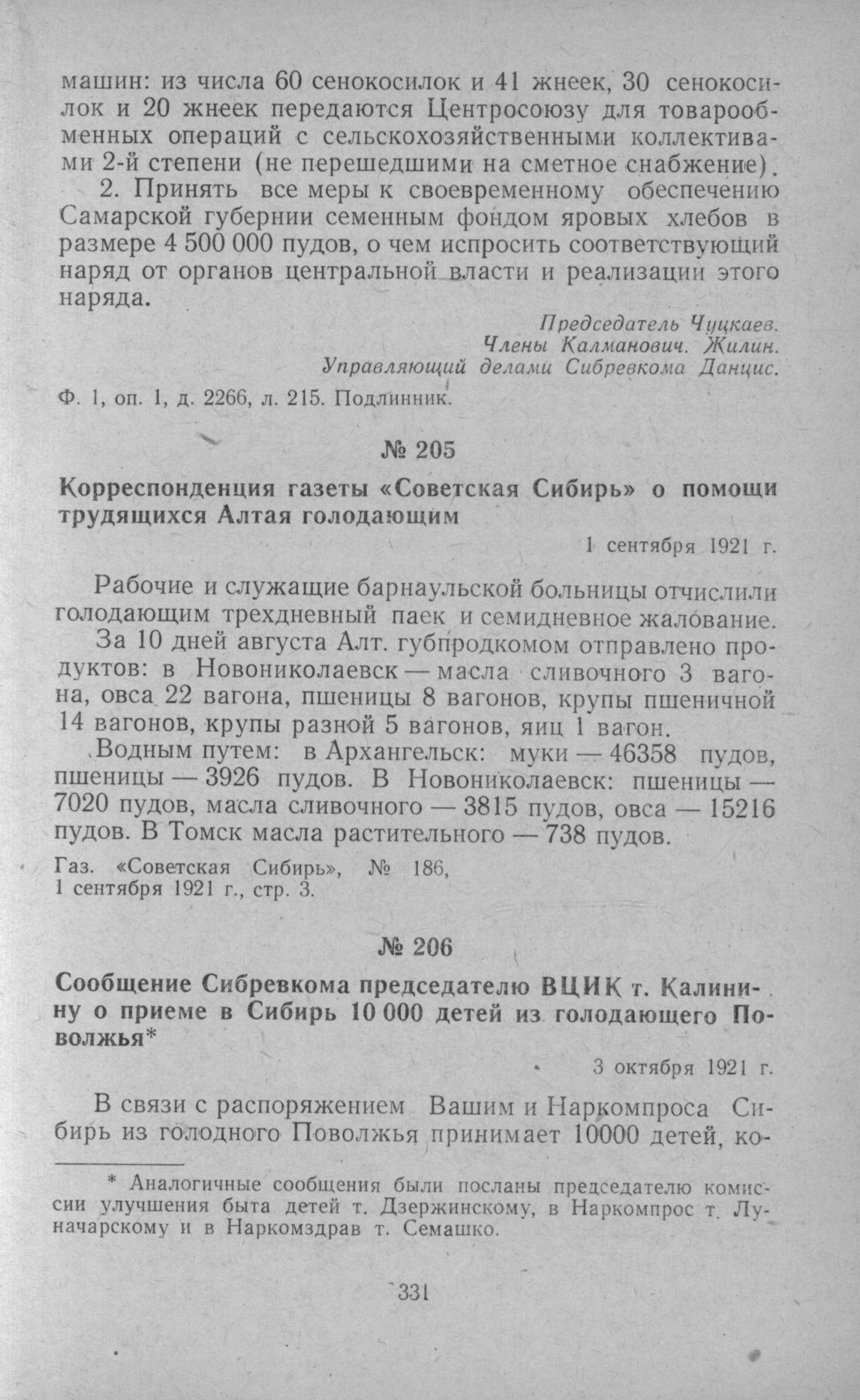 Сообщение Сибревкома председателю ВЦИК т. Калинину о приеме в Сибирь 10 000 детей из голодающего Поволжья. 3 октября 1921 г.