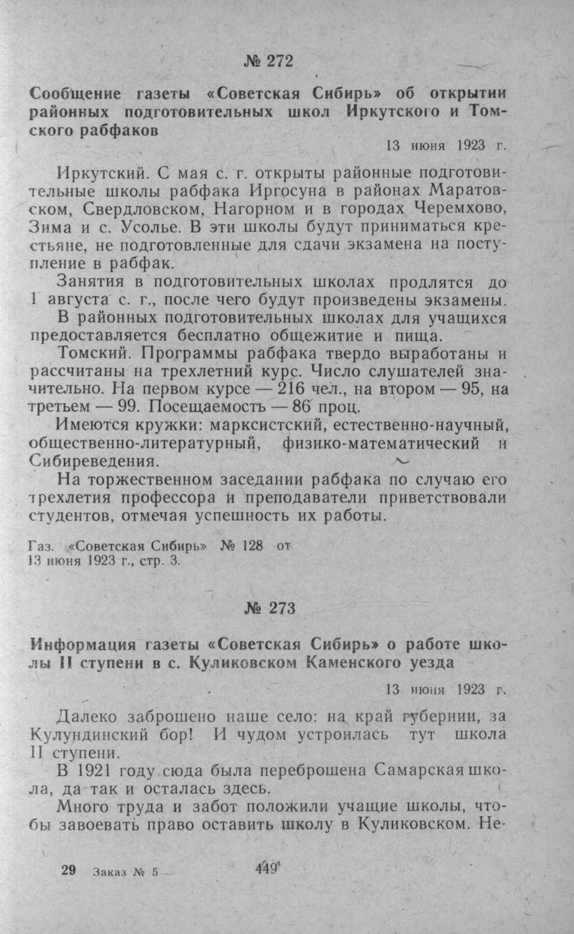 Сообщение газеты «Советская Сибирь» об открытии районных подготовительных школ Иркутского и Томского рабфаков. 13 июня 1923 г. // Советская Сибирь, № 128 от 13 июня 1923 г., стр. 3.
