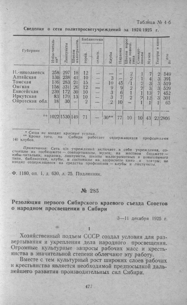 Сведения о сети политпросветучреждений за 1924/1925 г. // ГАНО. Ф. 1180. oп. 1, д. 630, л. 25. Подлинник.