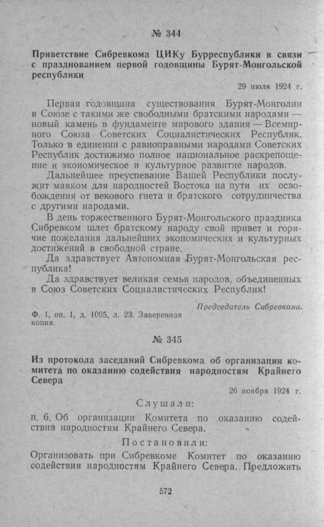 Из протокола заседаний Сибревкома об организации комитета по оказанию содействия народностям Крайнего Севера. 26 ноября 1924 г. // ГАНО. Ф. 1. oп. 1, д. 1436, л. 1. Заверенная копия.