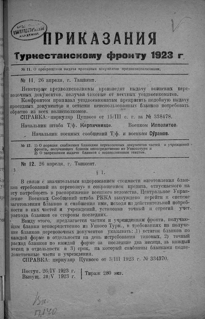 Приказание Туркестанскому фронту № 11. 26 апреля 1923 г., Ташкент. О прекращении выдачи проездных документов предволисполкомами