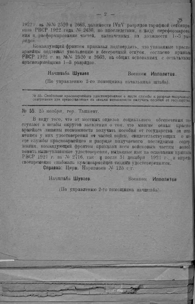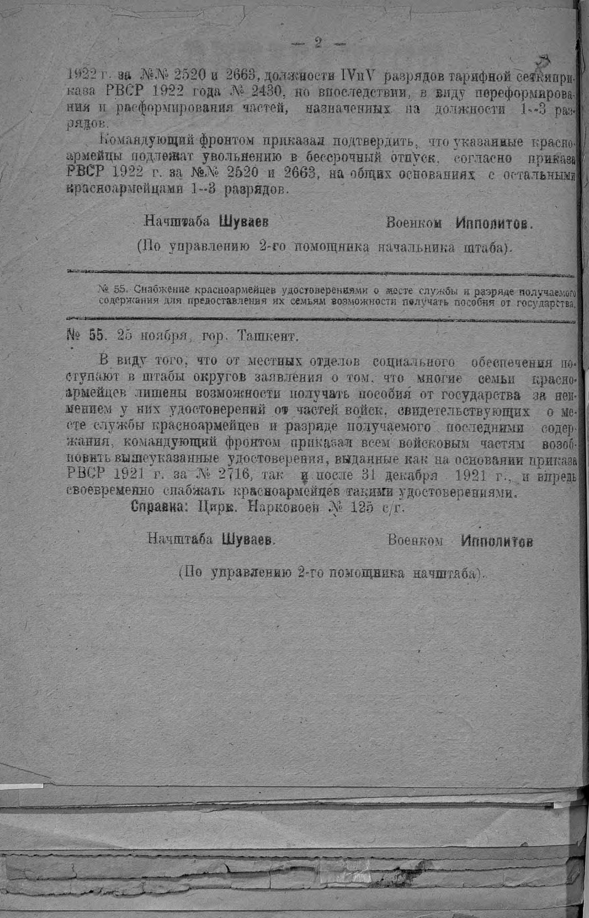 Приказание Туркестанскому фронту № 55. 25 ноября 1923 г., Ташкент. Снабжение красноармейцев удостоверениями о месте службы и разряде получаемого содержания для предоставления их семьям возможности получать пособия от государства (По управлению 2-го помощника начштаба)