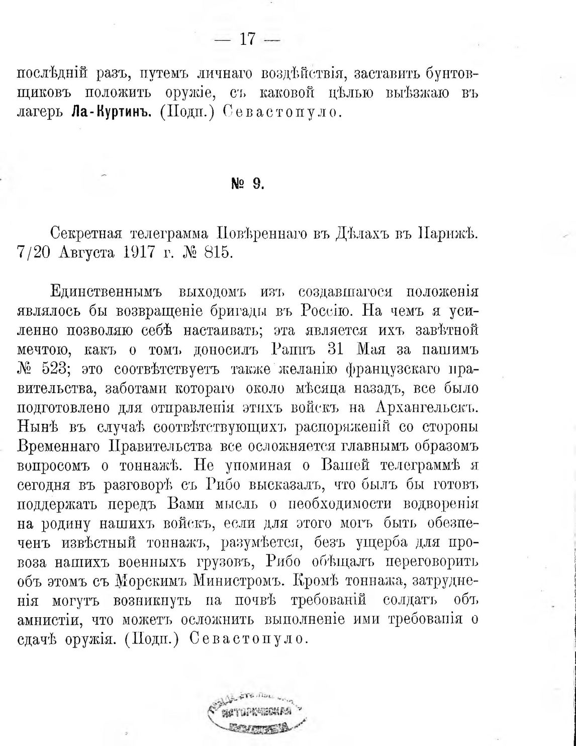 Русскіе солдаты во Францій. Секретная телеграмма Повѣреннаго въ Дѣлахъ въ Парижѣ. 7/20 Августа 1917 г. № 815