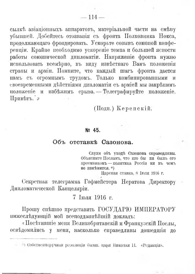 Объ отставкѣ Сазонова. Секретная телеграмма Гофмейстера Нератова Директору Дипломатической Канцеляріи. 7 Iюля 1916 г.