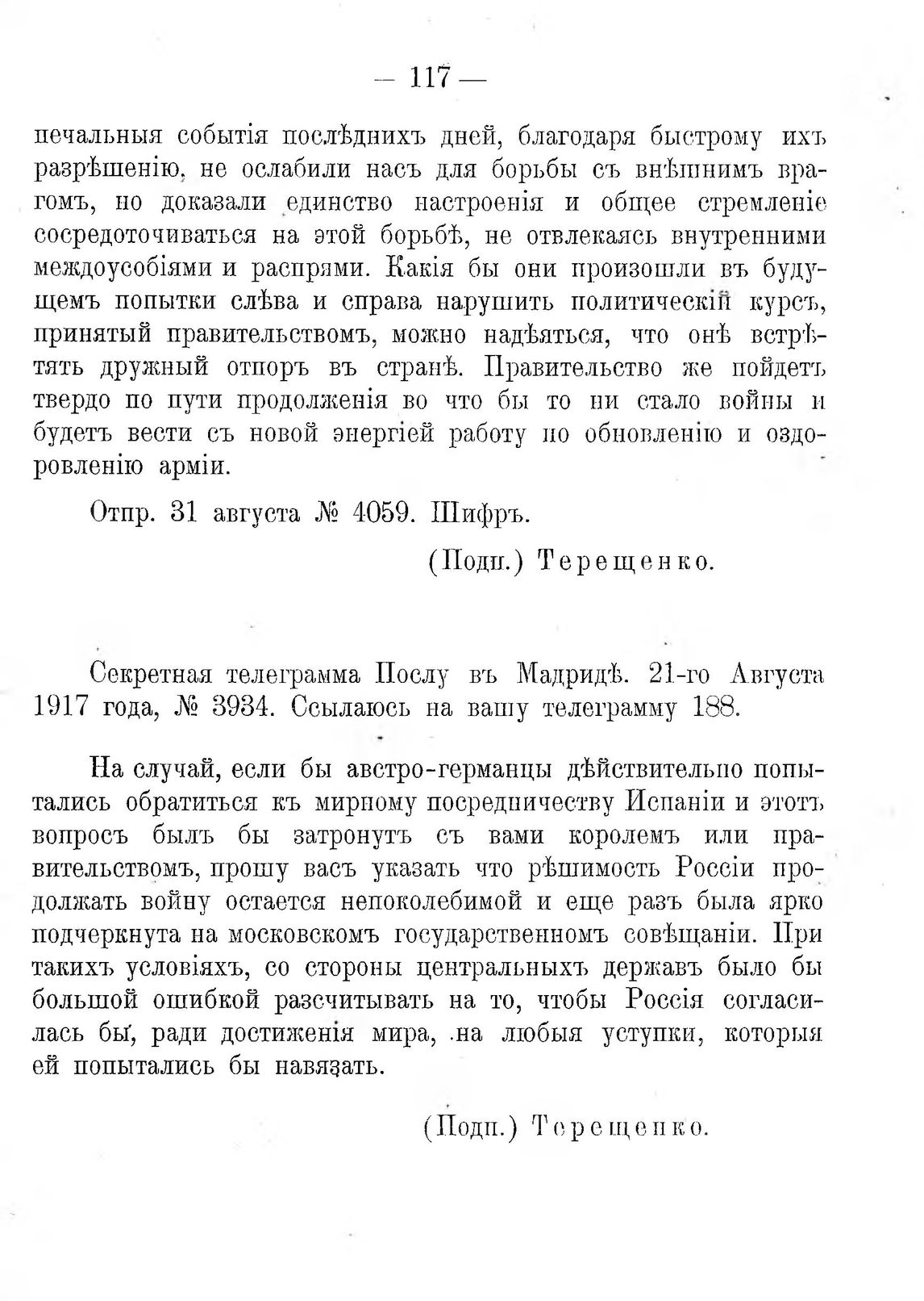 Сообщеніе Терещенко. Секретная телеграмма Послу въ Мадридѣ. 21-го Августа 1917 года, № 3934