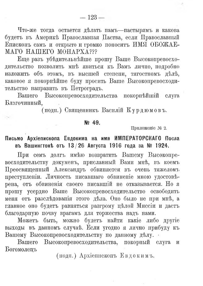 Письмо архіепископа Евдокима на имя Императорскаго Посла въ Вашингтонѣ Бахметева отъ 13/26 Августа 1916 года за № 1924