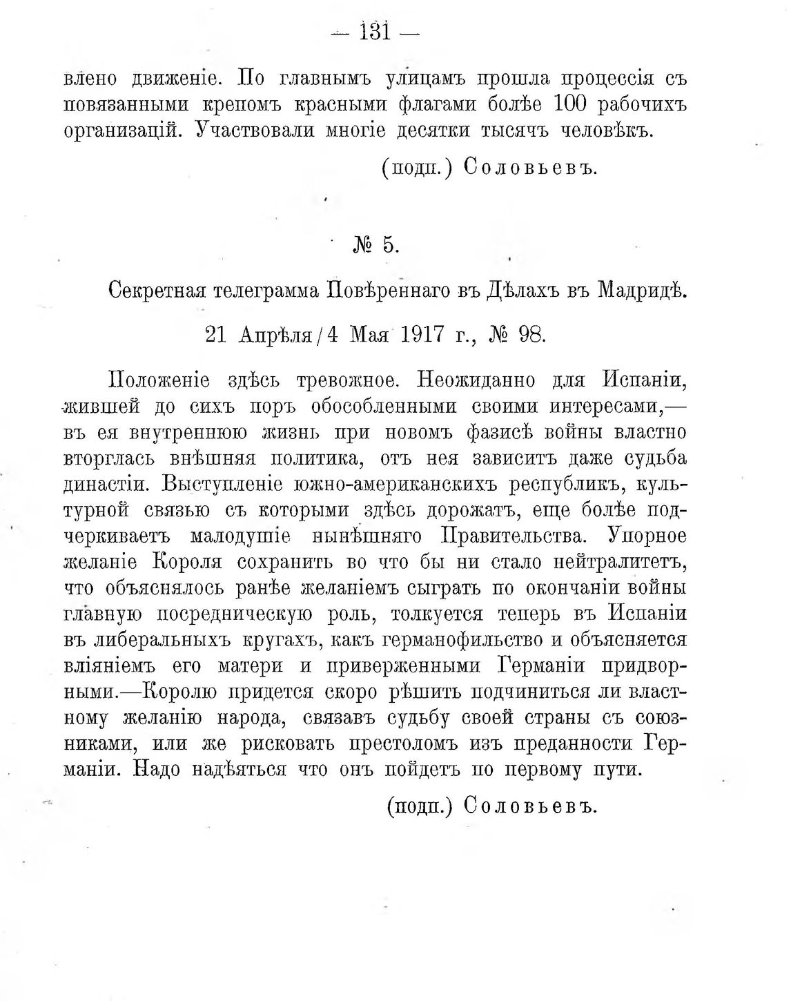 Испанская революція по секретными телеграммамъ бывш. Россійскихъ Пословъ въ Мадридѣ. № 5. Секретная телеграмма Повѣреннаго въ Дѣлахъ въ Мадридѣ. 21 Апрѣля/4 Мая 1917 г., № 98