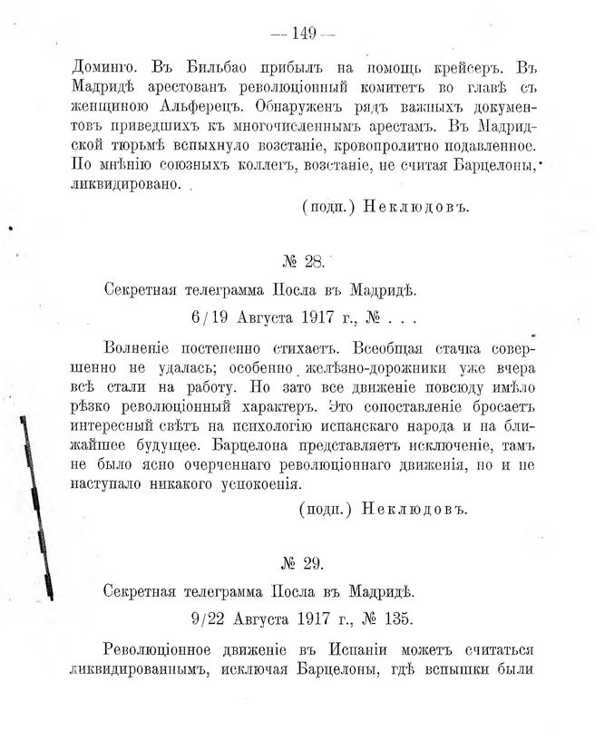 Испанская революція по секретными телеграммамъ бывш. Россійскихъ Пословъ въ Мадридѣ. № 29. Секретная телеграмма Посла въ Мадридѣ. 9/22 Августа 1917 г. № 135