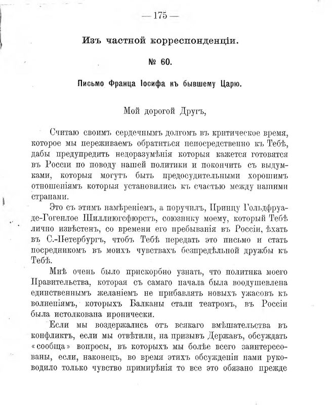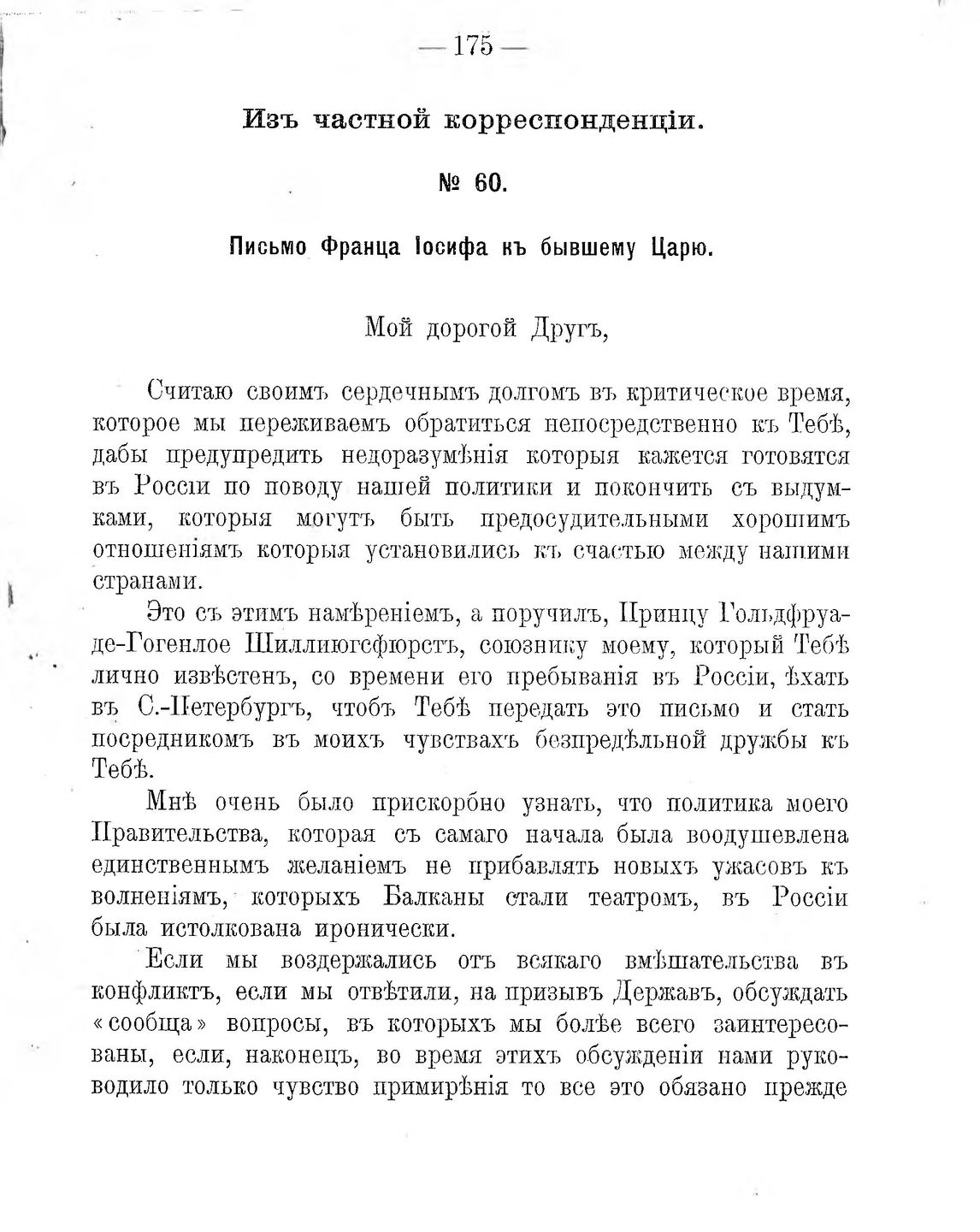 Из частной корреспонденцiи. Письмо Франца Іосифа къ бывшему Царю. В...