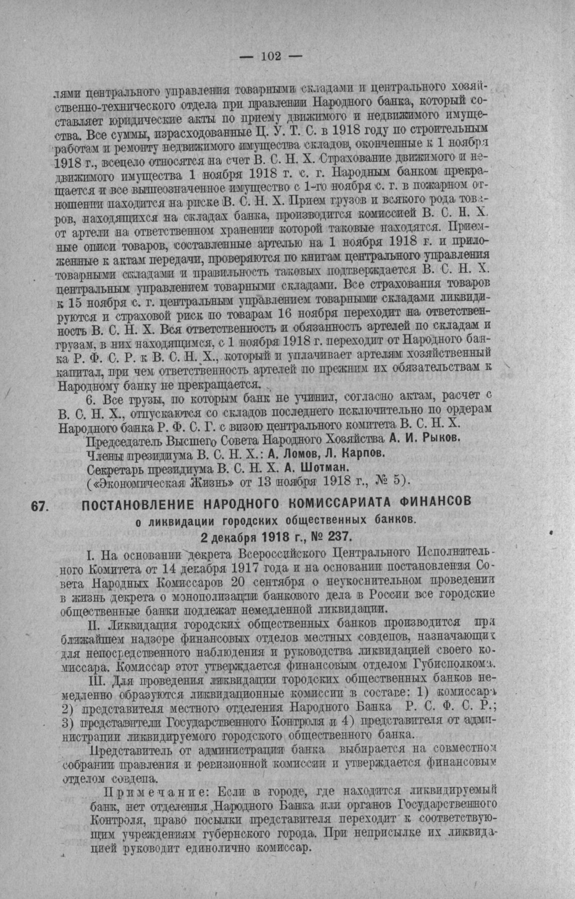 Постановление Народного Комиссариата Финансов о ликвидации городских общественных банков. 2 декабря 1918 г., № 237 // Экономическая Жизнь от 3 декабря 1918 г. № 22.