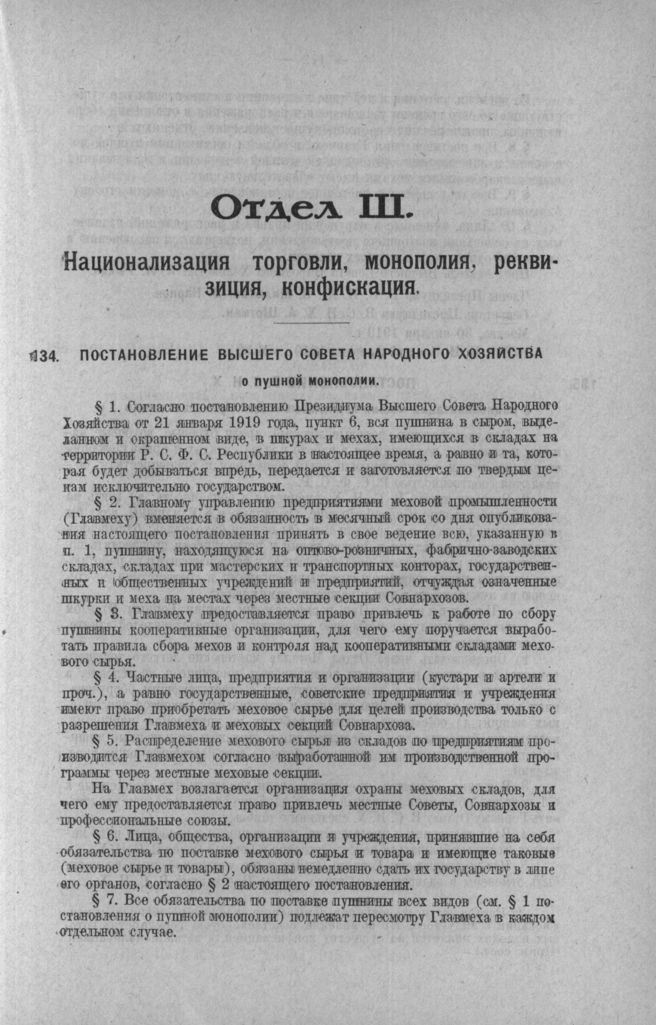 Постановление Высшего Совета Народного Хозяйства о пушной монополии. Москва, 30 января 1919 г. // Известия Ц. И. К. от 9 февраля 1919 г., № 30.