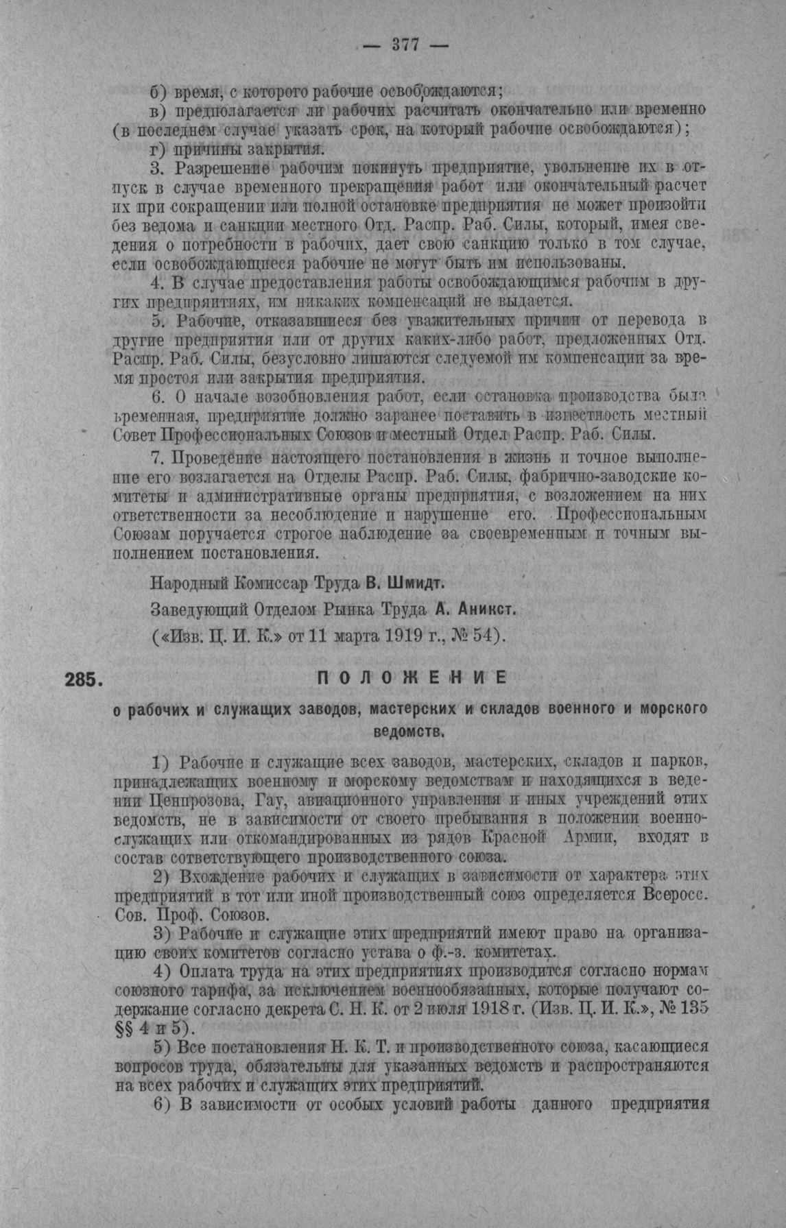 Положение о рабочих и служащих заводов, мастерских и складов военного и морского ведомств // Известия Ц. И. К. от 23 февраля 1919 г., № 42.
